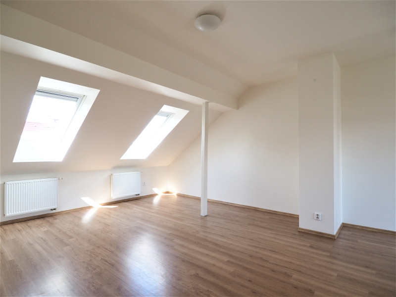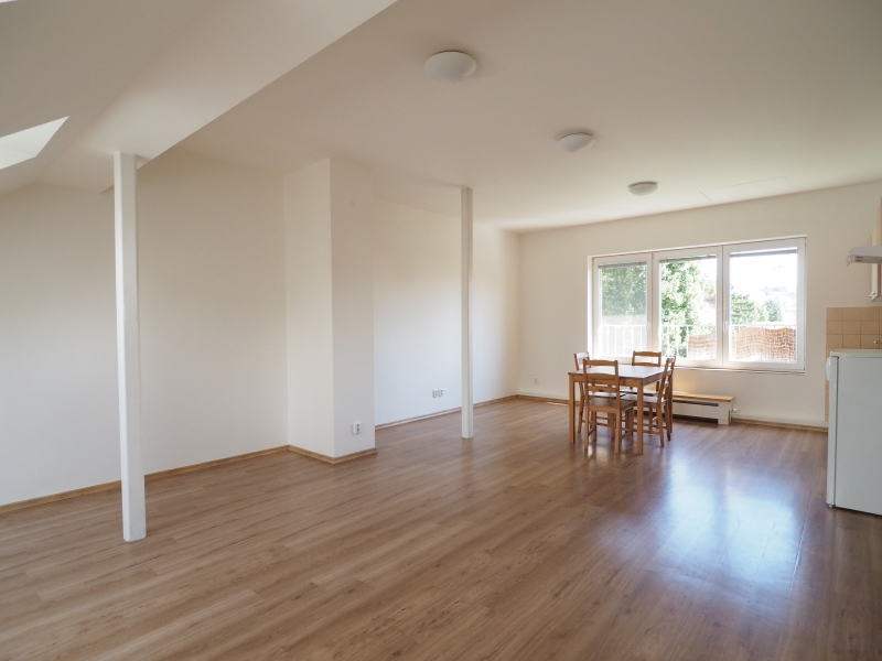 Dispoziční řešení bytu: vstupní předsíň s francouzským oknem do ulice a soukromým schodištěm do obytné části bytu. Byt je loftového typu, ložnicová část obytného prostoru má dvě střešní okna do klidné ulice a obývací denní část bytu s jídelním a kuchyňským koutem má velké okno s krásným výhledem nad zahrady. V obytné části je nová velká vestavná skříň, která může oddělovat oba pokoje od sebe.