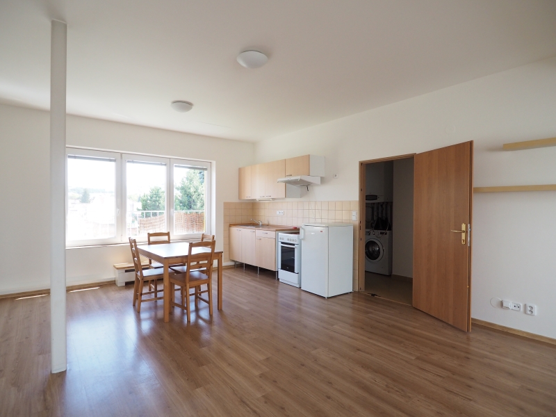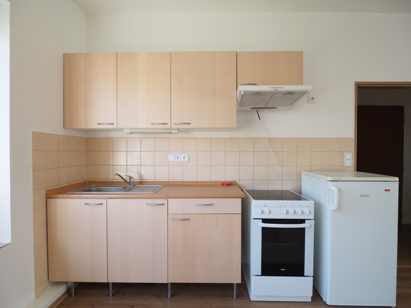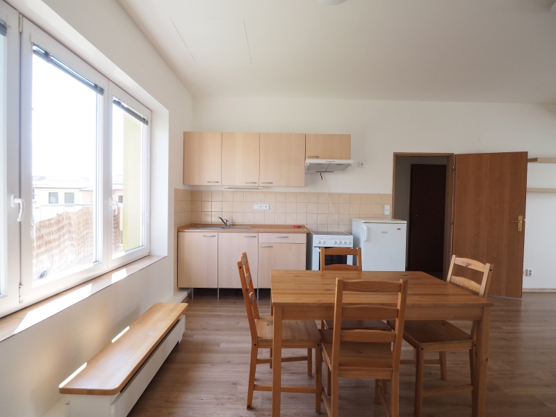 Vybavení: Kuchyňská linka včetně spotřebičů - sporák s pečící troubou, digestoř, lednice s mrazákem, jídelní stůl se židlemi, pračka, velká bílá vestavná skříň.
